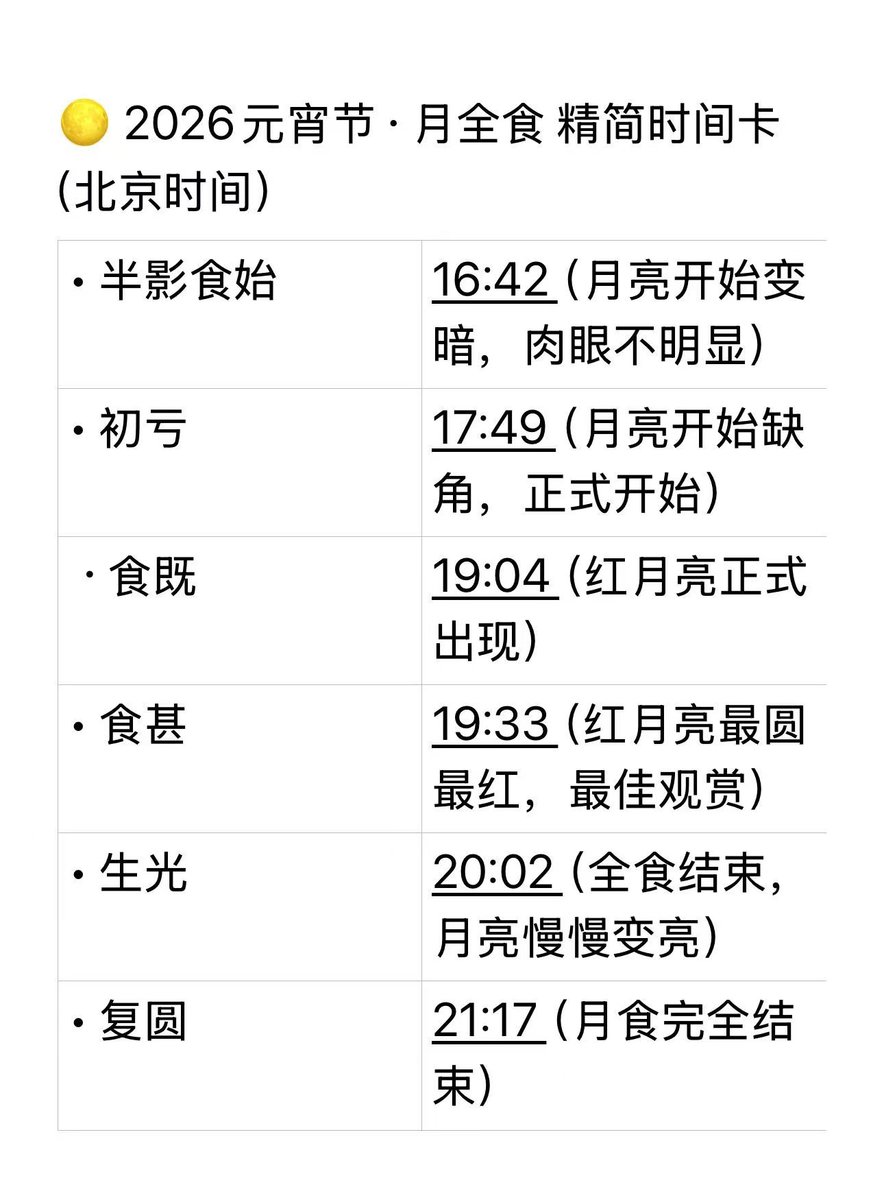 本次月全食核心时段为北京时间 19:04(食既)至 20:03(生光),月亮完全进入地球本影呈现标志性暗红色;食甚在 19:33,为观赏与拍摄的黄金时刻,全程至 21:17 复圆。这是 21 世纪我国观测条件最佳的元宵月全食,全国多数地区可在傍晚黄金时段肉眼观赏,无需专业设备。