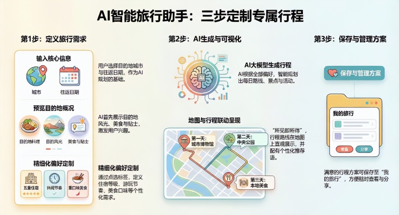 智能行程规划是核心功能,一开始我们想用纯AI生成路线。