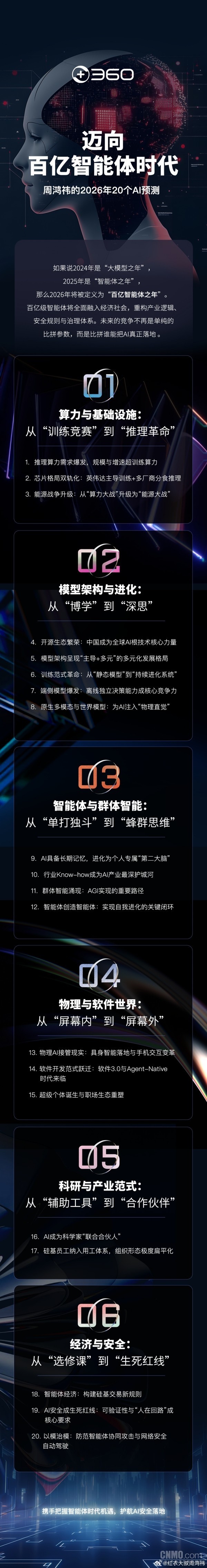 【CNMO科技消息】1月9日,360集团创始人周鸿祎发布2026年20个AI预测。他认为,如果说2024年是“大模型之年”,2025年是“智能体之年”,那么2026年将被定义为“百亿智能体之年”。百亿级智能体将全面融入经济社会,重构产业逻辑、安全规则与治理体系。未来的竞争不再是单纯的比拼参数,而是比拼谁能把AI真正落地。周鸿祎的2026年20个AI预测具体如下: