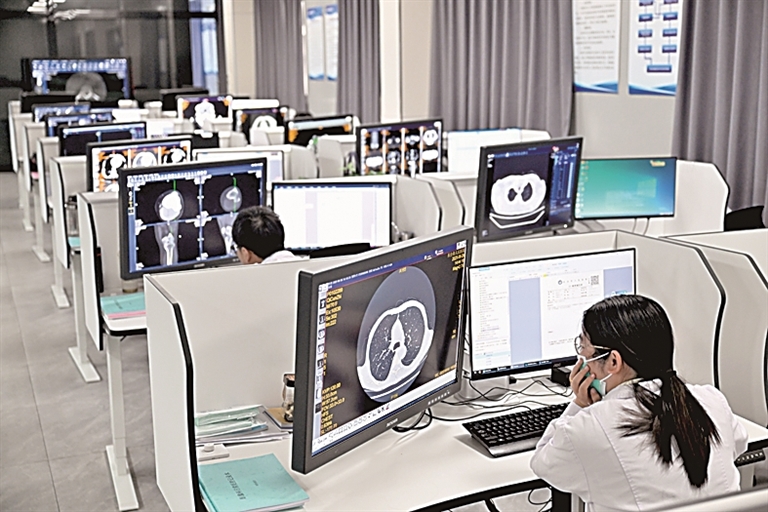 江苏东台市,影像云诊中心的医务人员集中读片。新华社发