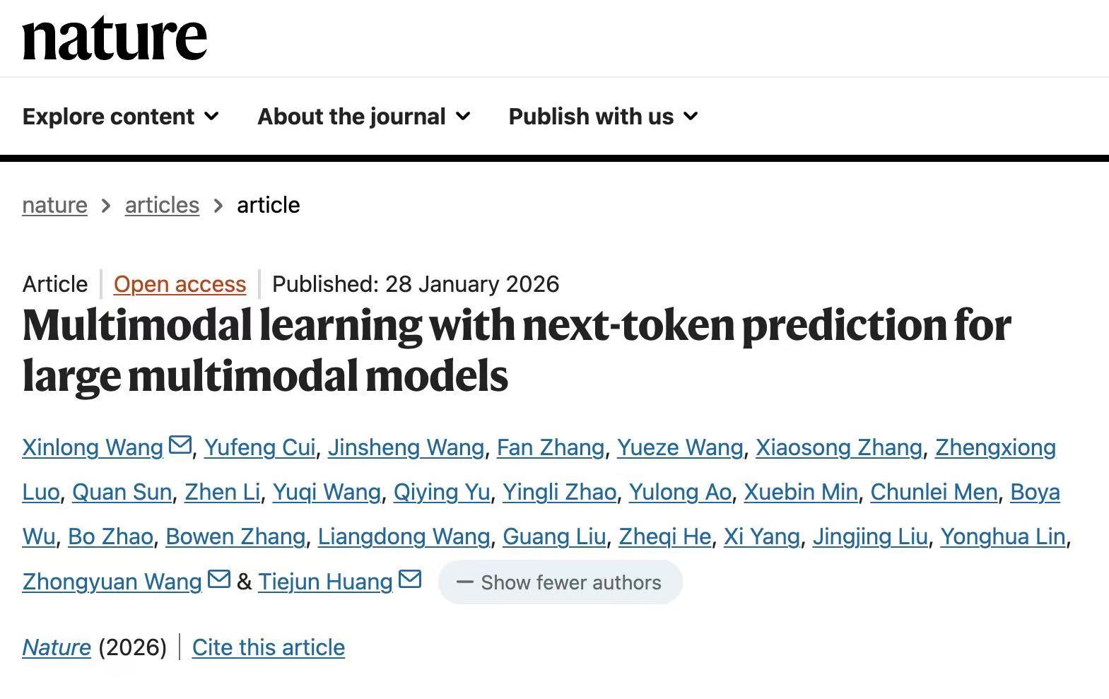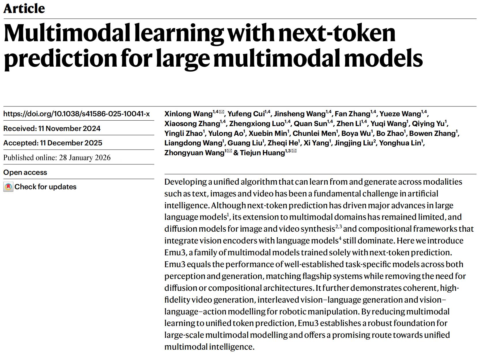 智东西2月1日报道,北京时间1月29日,北京智源人工智能研究院推出的多模态大模型“悟界·Emu”登上Nature正刊,成为继DeepSeek之后第二个达成此成就的中国大模型团队研究成果,也是中国首篇围绕多模态大模型路线的Nature论文。