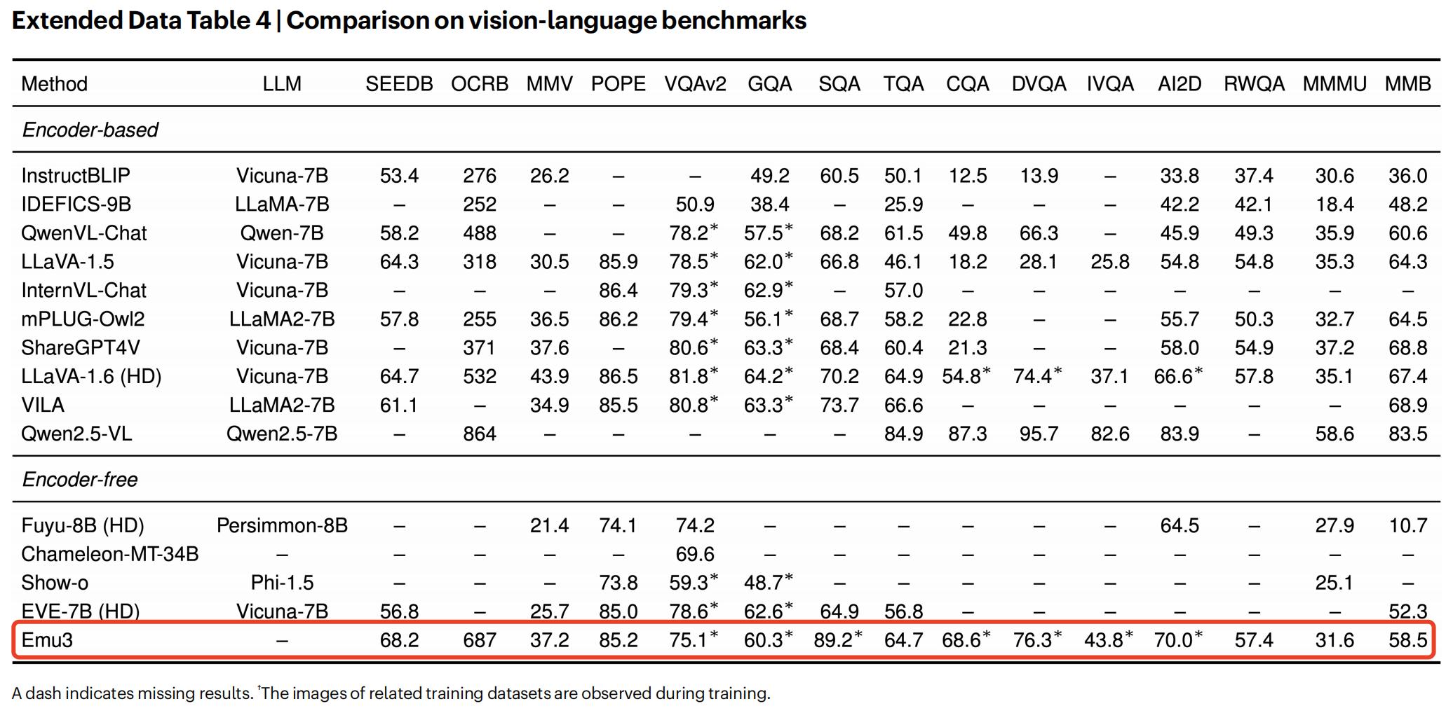 Emu3在视觉-语言理解能力方面的测评成绩