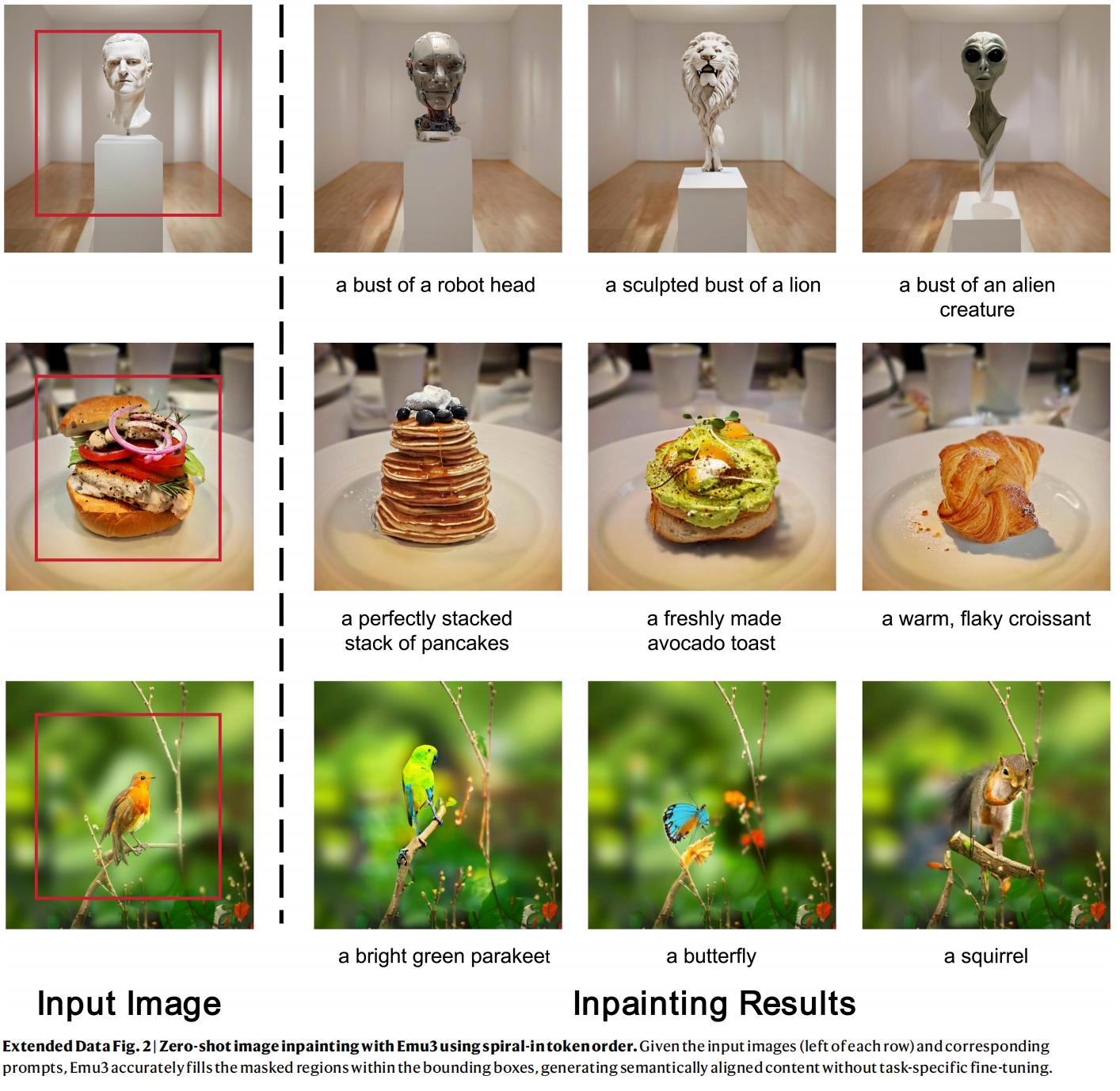 在零样本图像修复案例中,给定输入图像(每行左侧)和相应提示,Emu3能准确填充边界框内的掩码区域,生成语义对齐的内容,且无需特定任务的微调。