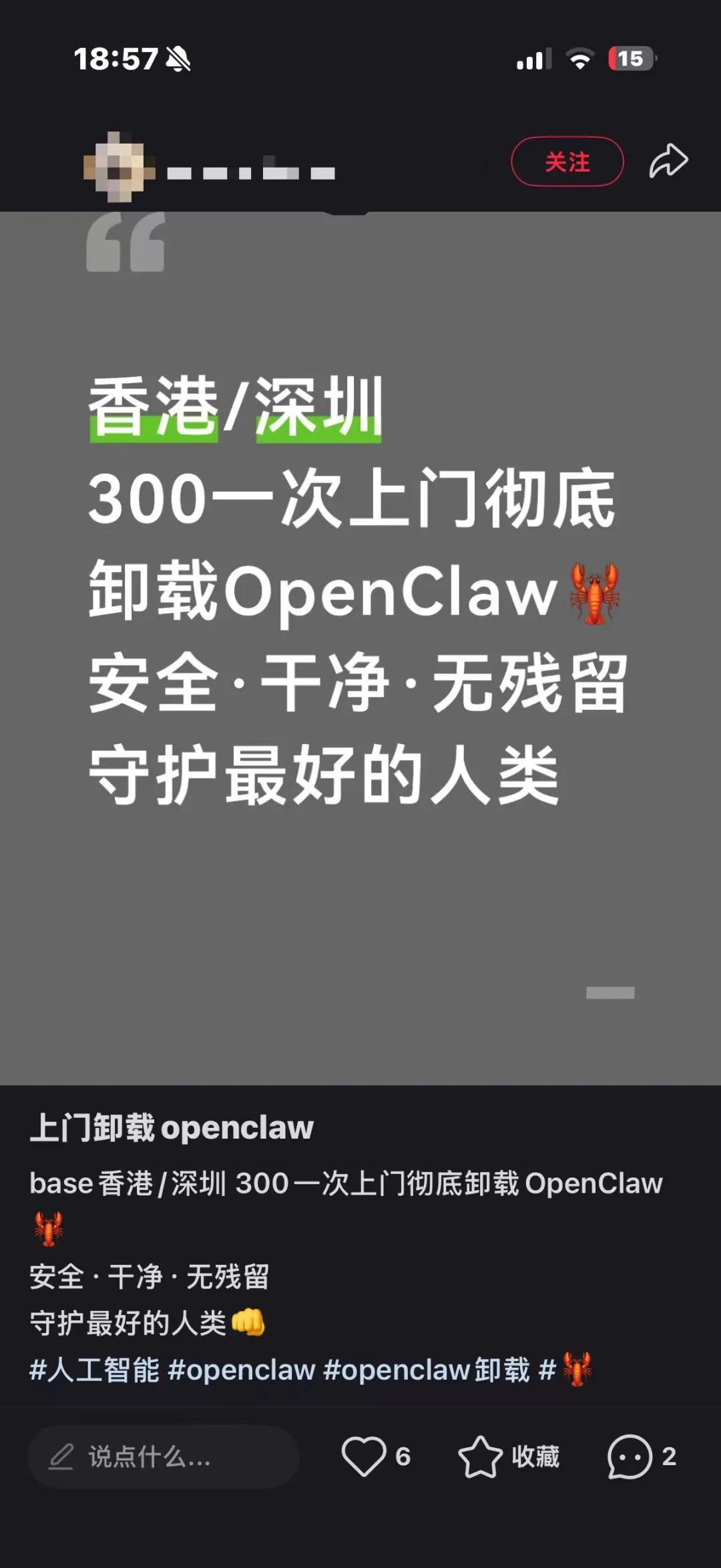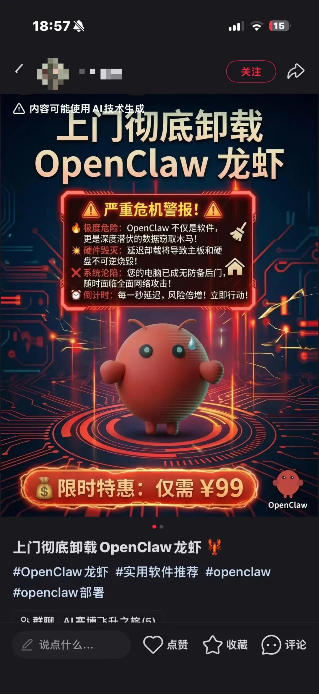 OpenClaw爆火后,最先赚钱的是上门安装,只不过还不到一周,上门“卸载”也成了新生意。当人们还沉浸在“雇佣数字牛马”的美梦中时,第一批“养虾人”已经开始连夜寻求卸载,催生了价值299元的上门彻底卸载服务,“龙虾卸载指南”也开始在网络上流传。