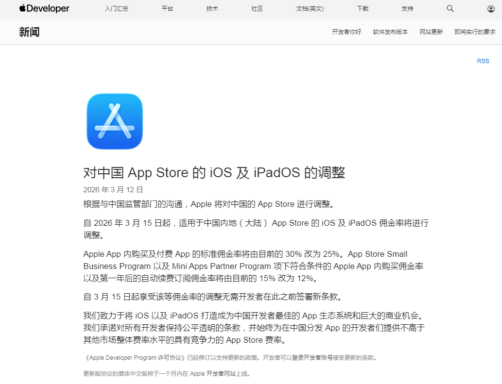自2026年3月15日起,适用于中国内地(大陆)App Store的iOS及iPadOS佣金率将进行调整。