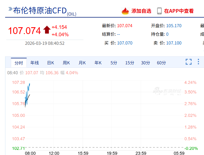 与此同时,国际油价持续大涨,截至8时40分,布伦特原油突破107美元/桶,日内涨超4%。纽约原油涨3.63%。 19日,美国天然气期货飙升,截至发稿涨6%,报3.215美元/百万英热。 中东地区关键能源基础设施遭遇新的袭击,重新引发了市场对能源价格上涨的担忧。 以色列方面18日消息称,以色列国防军当天袭击了位于伊朗南部布什尔的伊朗“最大天然气设施”。该设施处理伊朗40%的天然气。 当地时间19日,伊朗方面消息称,伊朗再次对“驻扎有伊朗敌人的海湾国家”的石油设施发动袭击。 阿联酋阿布扎比媒体办公室19日证实,因拦截来袭导弹产生的碎片坠落,该国哈卜尚天然气设施和巴卜油田受到影响。其中,哈卜尚天然气设施已暂时关闭。 美国总统特朗普18日宣布,暂停《琼斯法案》实施60天,解除往来国内港口船运限制,以期遏制因霍尔木兹海峡实际关闭而导致的油价上涨。白宫新闻秘书卡罗琳·莱维特说:“这项措施将允许石油、天然气、化肥和煤炭等重要资源在60天内自由流向美国港口。” 受中东战事升级引发的进一步担忧影响,国际油价18日交易时段保持上行态势。5月交货的伦敦布伦特原油期货价格盘中一度突破每桶110美元。