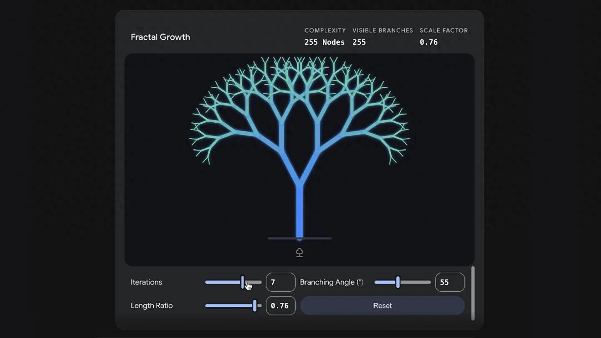 要使用这一新功能,Google建议用户在提问时以“Show me(展示给我)”或“Help me visualize(帮我可视化)”这样的语句开头,并确保在 Gemini 中选择“Pro”模型,以调用相关能力。 例如,输入“Visualize how fractals work(可视化分形是如何运作的)”时,Gemini 会生成分形生长的动态图像,用户可以调整分支角度、长度比例和迭代次数等参数,观察分形形态的变化。