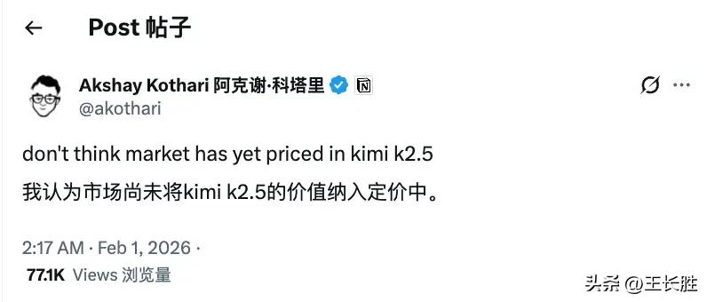 还有Notion的联合创始人Akshay Kothari,最近也很反常地在社交媒体上发了条无关Notion的内容,也是讨论Kimi K2.5,说“市场还没反应过来这东西的价值”。