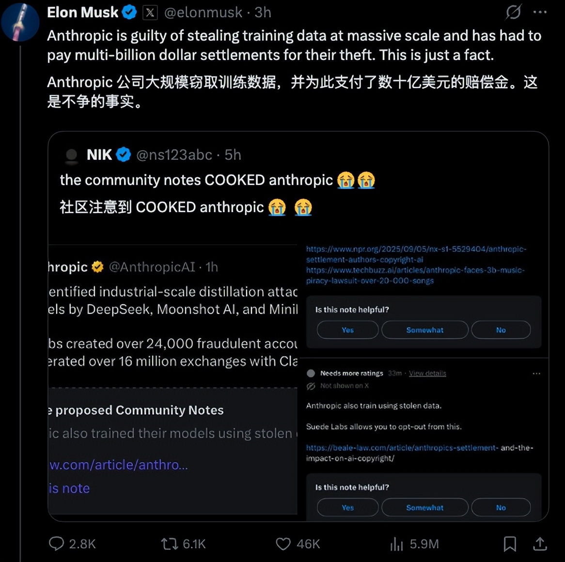 随后,xAI的马斯克(ElonMusk)在X平台上回应此事称,Anthropic大规模窃取训练数据,并为此支付了数十亿美元的赔偿金。这是不争的事实。
