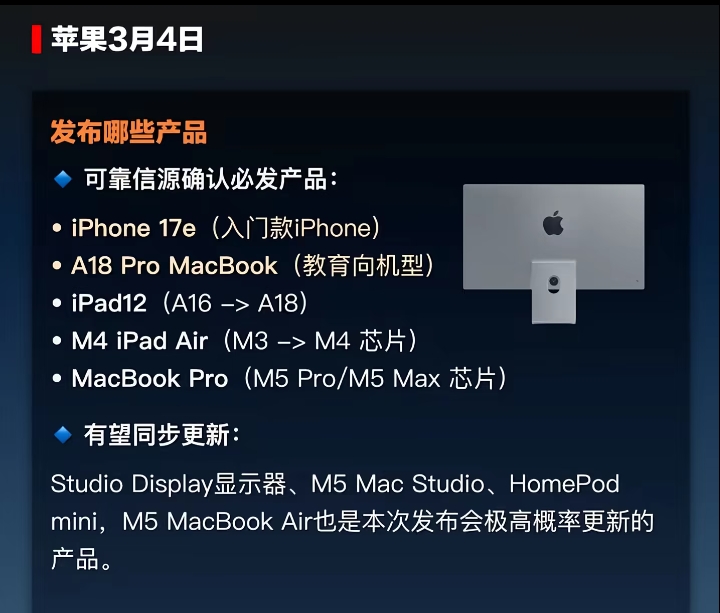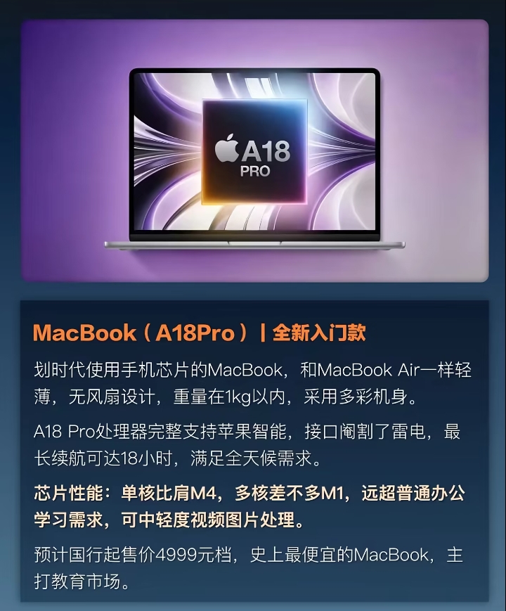 3月4日压轴发Mac:入门款MacBook用A18 Pro芯片,多彩机身,约4000元就能入;MacBook Pro 14/16英寸升级M5 Pro/Max,专业性能拉满,办公、创作都能扛。