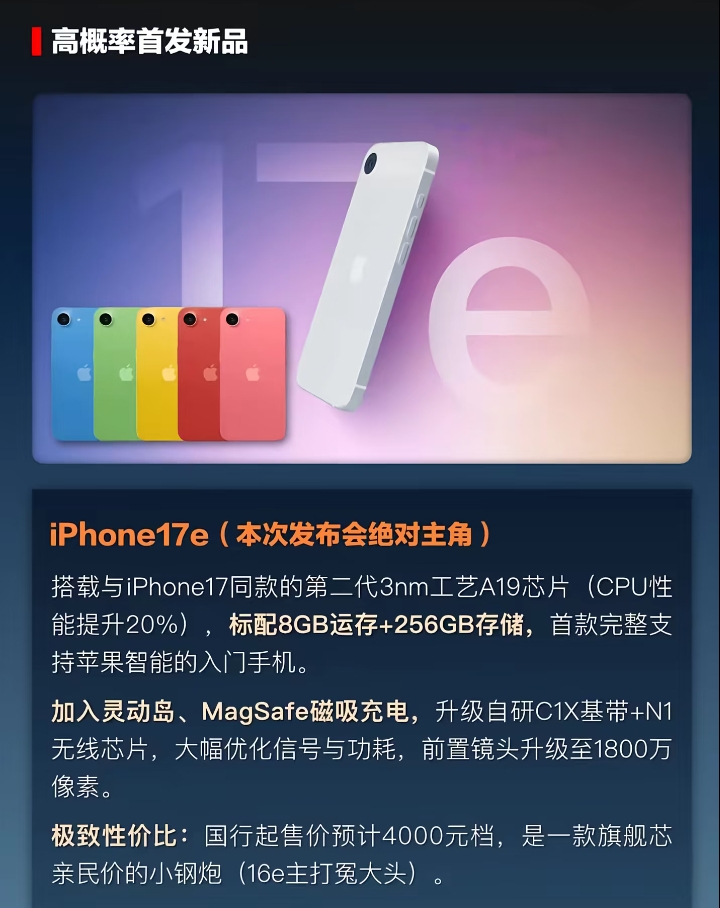 3月2日登场的是iPhone 17e,作为入门主力,搭载A19芯片和C1X基带,性能翻倍,4800万主摄,256GB起步,国行4499元起,3月4日晚预售、11日发售,学生党、备用机党很合适。