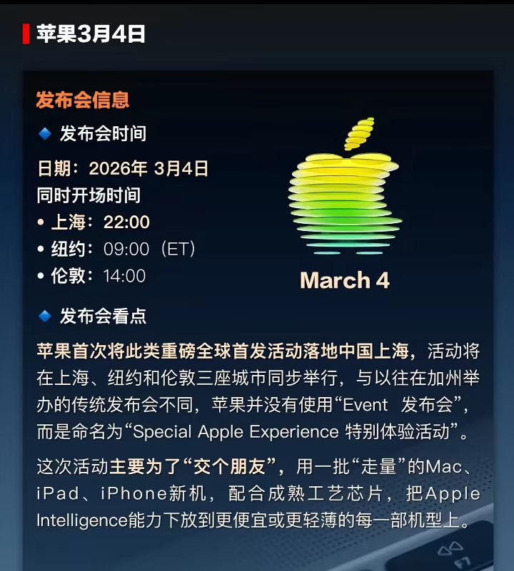 2026苹果春季发布会已经正式结束,这次玩法很特别,3月2日—4日三天分批官宣,3月4日22点在上海压轴收官,纽约、伦敦同步线下体验,也是苹果首次把春季全球主场放在中国。